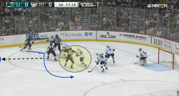Instead of Chris Kunitz, we see Daniel Winnik (#26) playing on the right wing. Â He sets the same pick and then positions himself to screen San Jose goaltender Alex Stalock.